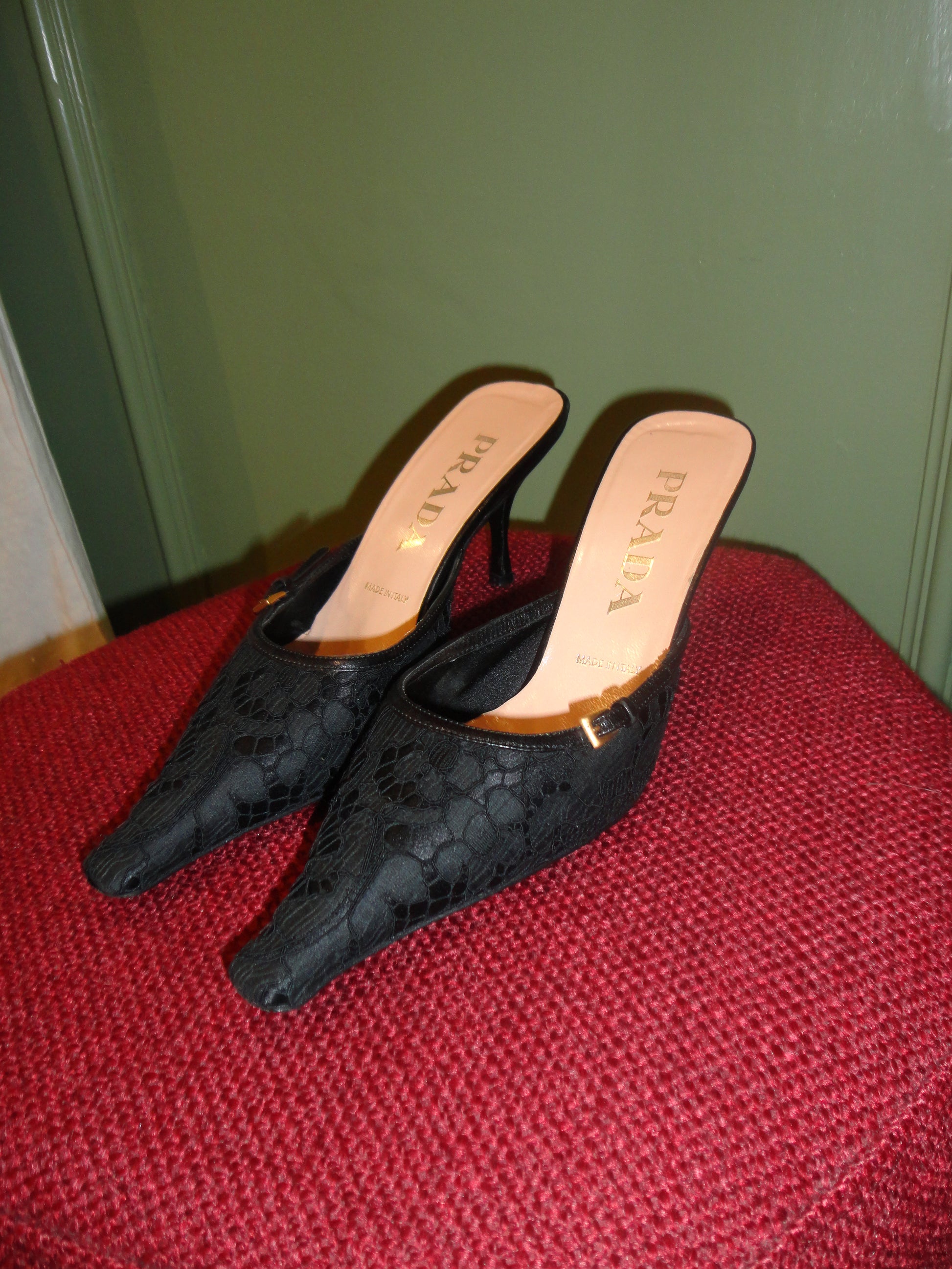 Beautiful Prada Vintage Lace mules perfect for a winter night out with tights and a pretty black dress.