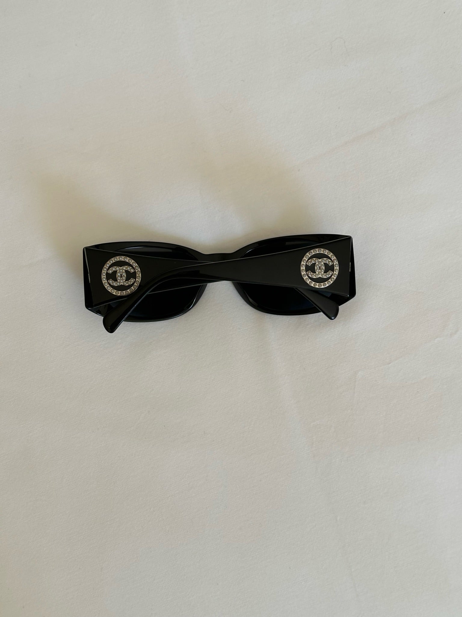 Vintage black Chanel sunglasses with pearl detailing. The perfect black pair of sunglasses, a statement piece. The original Chanel case is included.