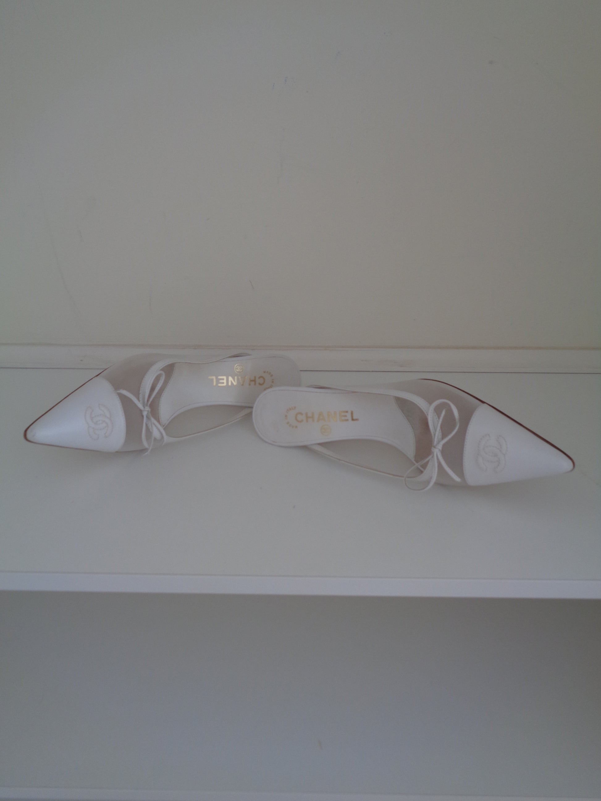 Very rare vintage Chanel CC white mesh knit mules, with leather toe cap. The essential white pair of heels for your summer wardrobe.